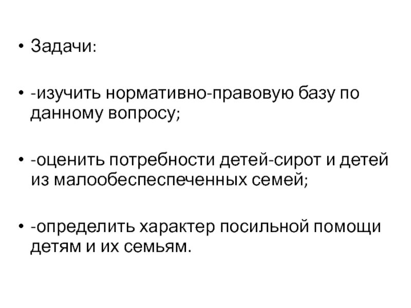 Задачи:-изучить нормативно-правовую базу по данному вопросу;-оценить потребности детей-сирот и детей из малообеспеспеченных семей;-определить характер посильной помощи детям
