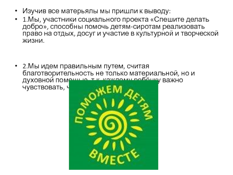 Изучив все матерьялы мы пришли к выводу:1.Мы, участники социального проекта «Спешите делать добро», способны помочь детям-сиротам реализовать