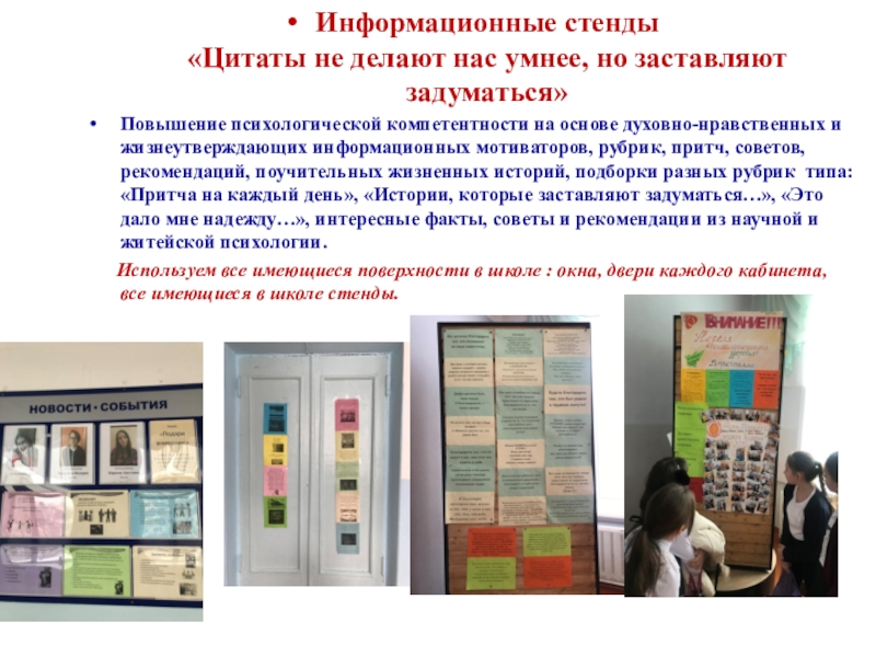 Повышение психологической компетентности на основе духовно-нравственных и жизнеутверждающих информационных мотиваторов, рубрик, притч, советов, рекомендаций, поучительных жизненных историй, подборки разных рубрик типа: «Притча на каждый день», «Истории, которые заставляют задуматься…», «Это дало мне надежду…», интересные факты, советы и рекомендации из научной и житейской психологии.
