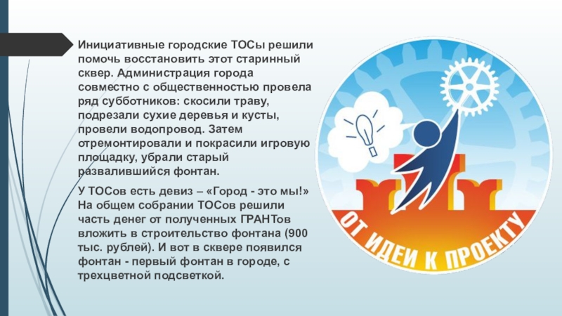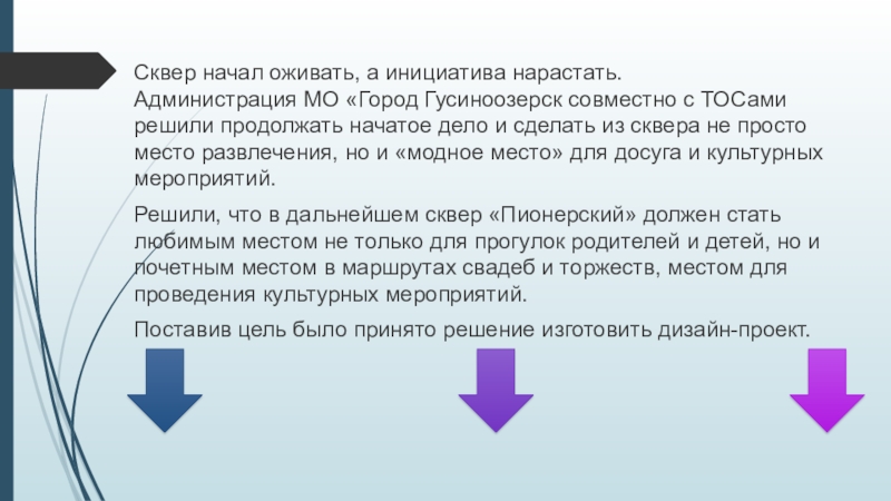 В свое время этот сквер был местом культуры и отдыха горожан. Сквер расположен в центре города Гусиноозерск.Рядом находится детский сад, Школа искусств, центр социальной помощи семье и детям, детская поликлиника и жилой массив. Площадь парка составляет 1.57 гектара. До настоящего времени предметом деятельности сквера являлась только одна игровая площадка, построенная на средства ТОС.