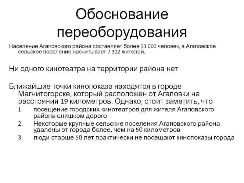Обоснование переоборудованияНаселение Агаповского района составляет более 33 000 человек, а Агаповское сельское поселение насчитывает 7 312 жителей.Ни