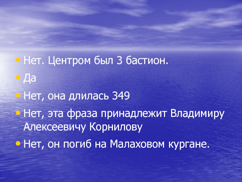 Нет. Центром был 3 бастион.ДаНет, она длилась 349Нет, эта фраза принадлежит Владимиру Алексеевичу КорниловуНет, он погиб на