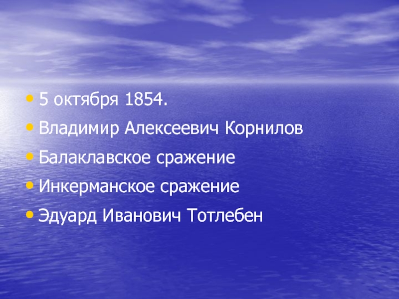5 октября 1854.Владимир Алексеевич КорниловБалаклавское сражениеИнкерманское сражениеЭдуард Иванович Тотлебен