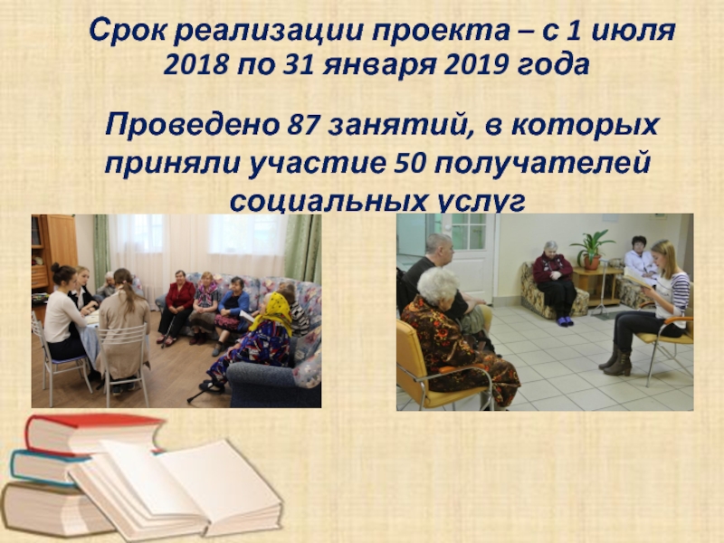 Слайд 6 Проведено 87 занятий, в которых приняли участие 50 получателей социальных