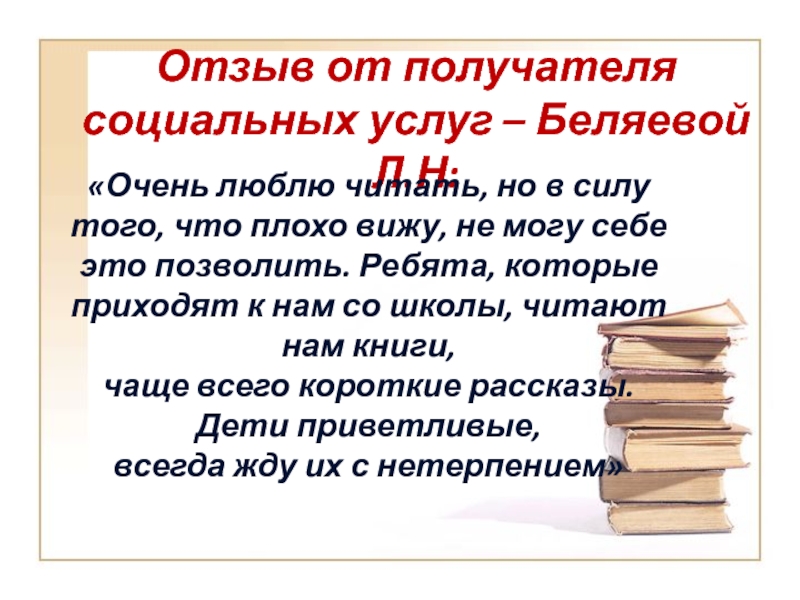 Слайд 13Отзыв от получателя социальных услуг – Беляевой Л.Н: