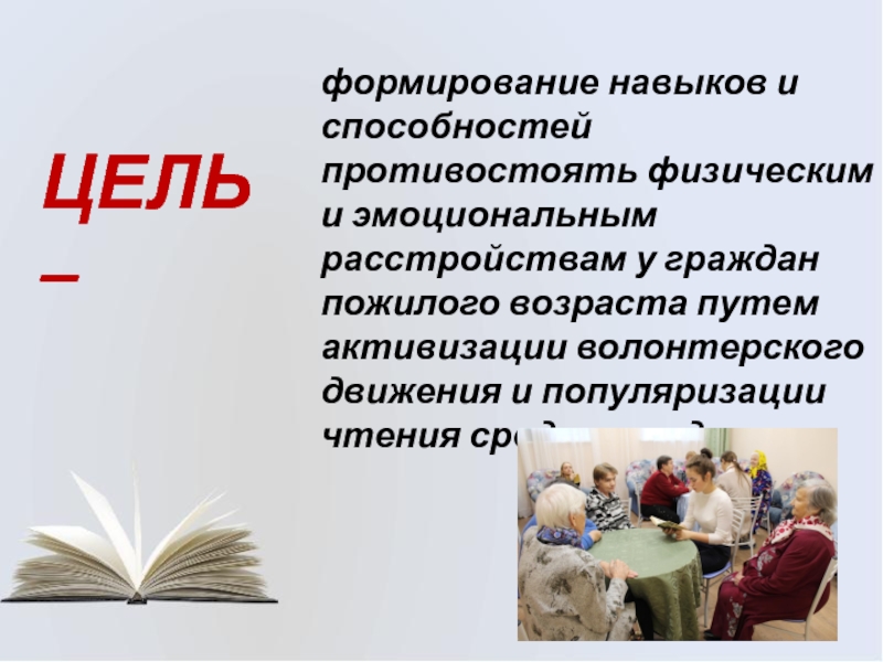 ЦЕЛЬ –формирование навыков и способностей противостоять физическим и эмоциональным расстройствам у граждан пожилого возраста путем активизации волонтерского