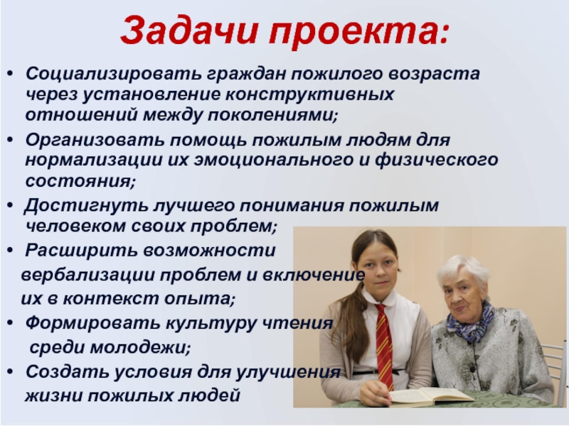 Задачи проекта:Социализировать граждан пожилого возраста через установление конструктивных отношений между поколениями;Организовать помощь пожилым людям для нормализации их