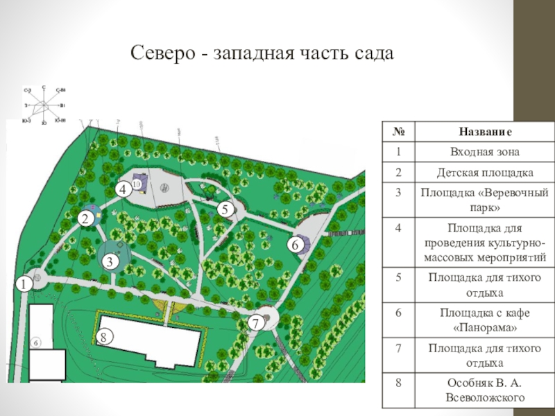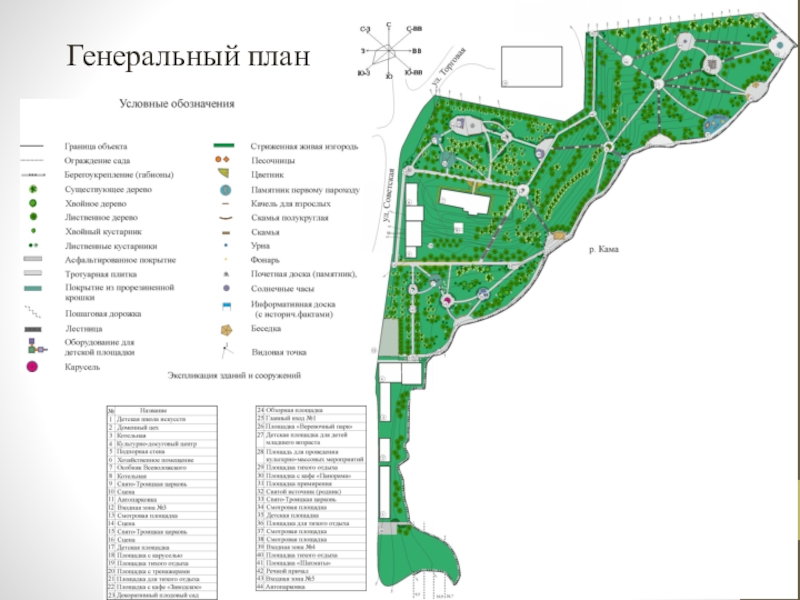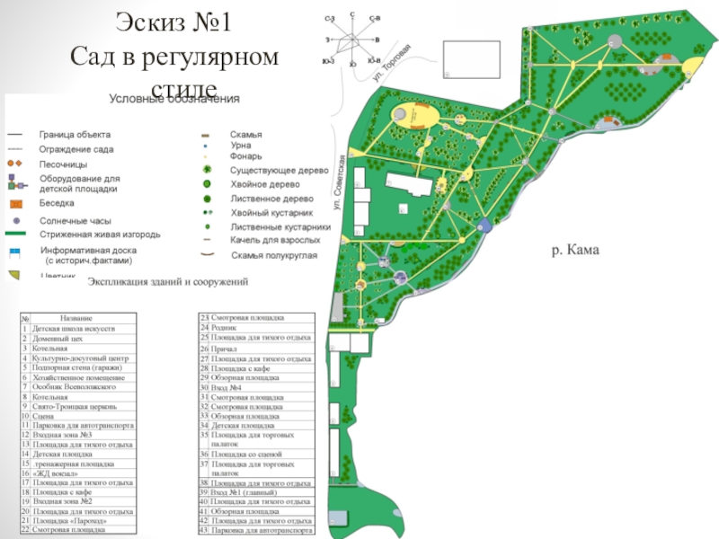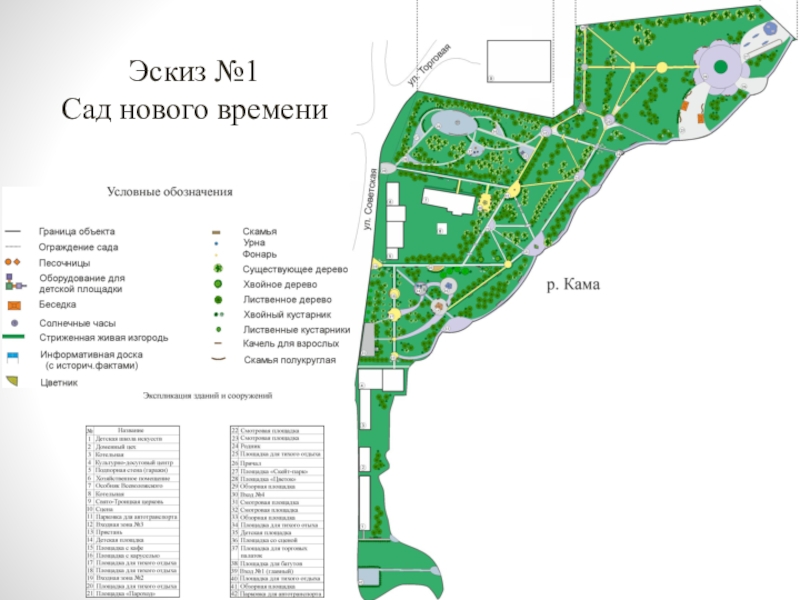 Определено архитектурно-планировочное решение объекта, выбран смешанный стиль планировки Княжеского сада, сочетающий в себе элементы пейзажного и регулярного стилей. На территории сада появилась развитая дорожно-тропиночная сеть, разместились различные площадки отдыха и игровые зоны.