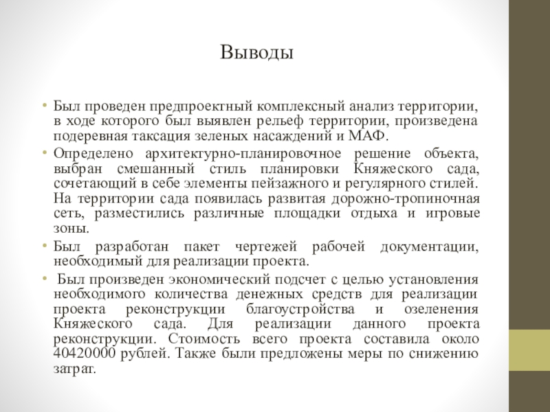 Был произведен экономический подсчет с целью установления необходимого количества денежных средств для реализации проекта реконструкции благоустройства и озеленения Княжеского сада. Для реализации данного проекта реконструкции. Стоимость всего проекта составила около 40420000 рублей. Также были предложены меры по снижению затрат.