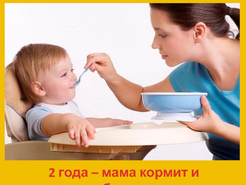 Слайд 42 года – мама кормит и убирает.