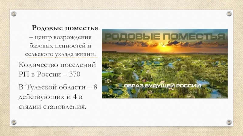 Слайд 7 Родовые поместья – центр возрождения базовых ценностей и сельского уклада