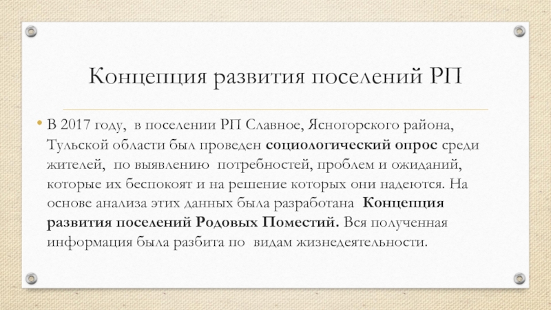 по выявлению потребностей, проблем и ожиданий, которые их беспокоят и на решение которых они надеются. На основе анализа этих данных была разработана Концепция развития поселений Родовых Поместий. Вся полученная информация была разбита по видам жизнедеятельности.