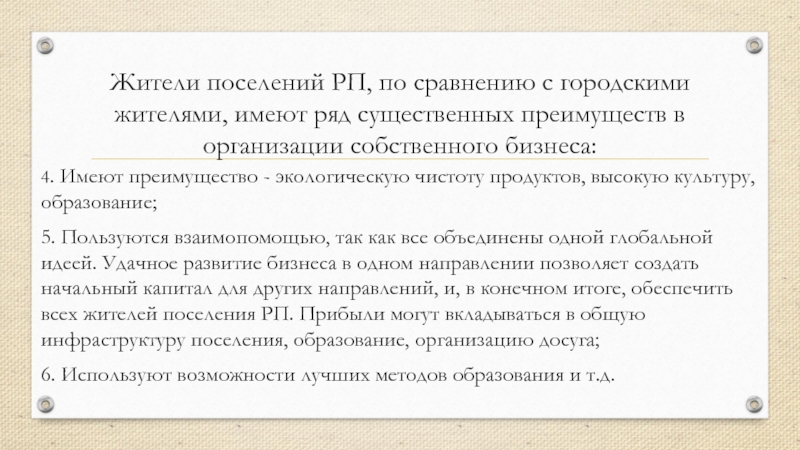 5. Пользуются взаимопомощью, так как все объединены одной глобальной идеей. Удачное развитие бизнеса в одном направлении позволяет создать начальный капитал для других направлений, и, в конечном итоге, обеспечить всех жителей поселения РП. Прибыли могут вкладываться в общую инфраструктуру поселения, образование, организацию досуга;