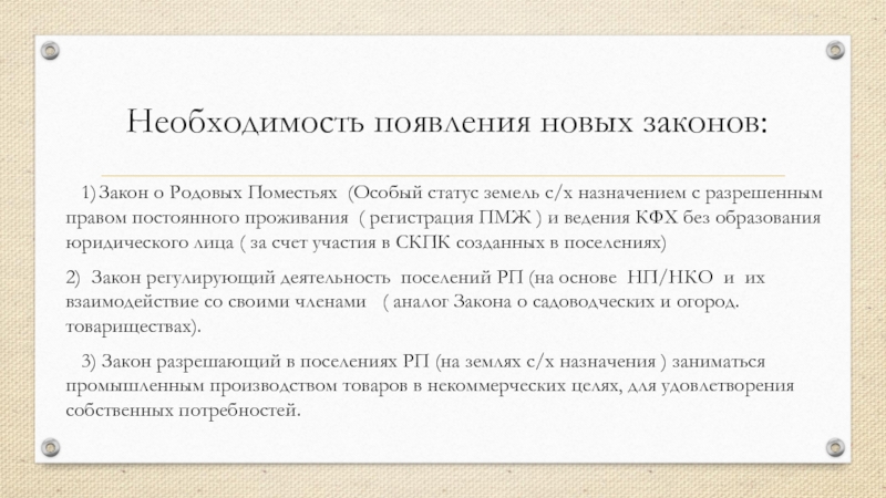 3) Закон разрешающий в поселениях РП (на землях с/х назначения ) заниматься промышленным производством товаров в некоммерческих целях, для удовлетворения собственных потребностей.