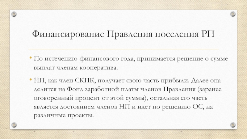 прибыли. Далее она делится на Фонд заработной платы членов Правления (заранее оговоренный процент от этой суммы), остальная его часть является достоянием членов НП и идет по решению ОС, на различные проекты.