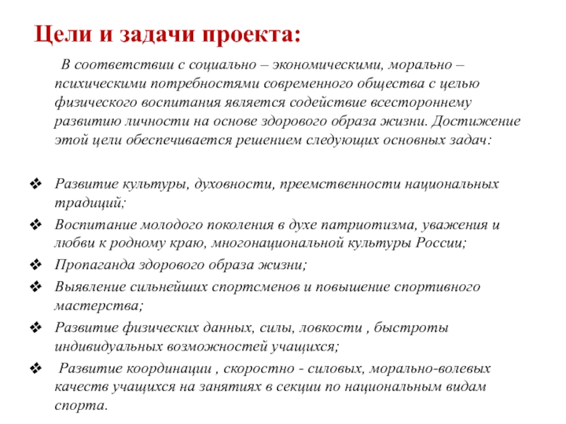 учащихся, воспитание культурных и духовных ценностей и разумного использования их свободного времени. Систематические физические нагрузки укрепляют сердечно - сосудистую систему и органы дыхания. В связи с этим актуальность проекта очевидно.