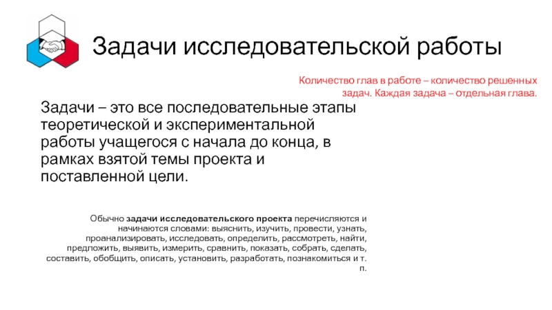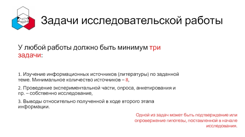 Одной из задач может быть подтверждение или опровержение гипотезы, поставленной в начале исследования.