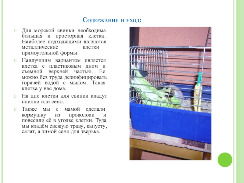 Также мы с мамой сделали кормушку из проволоки и повесили её в уголке клетки. Туда мы кладём свежую траву, капусту, салат, а зимой сено для зверька.