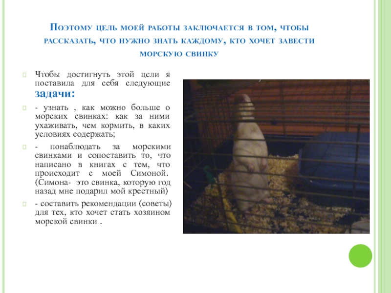 - понаблюдать за морскими свинками и сопоставить то, что написано в книгах с тем, что происходит с моей Симоной. (Симона- это свинка, которую год назад мне подарил мой крестный)