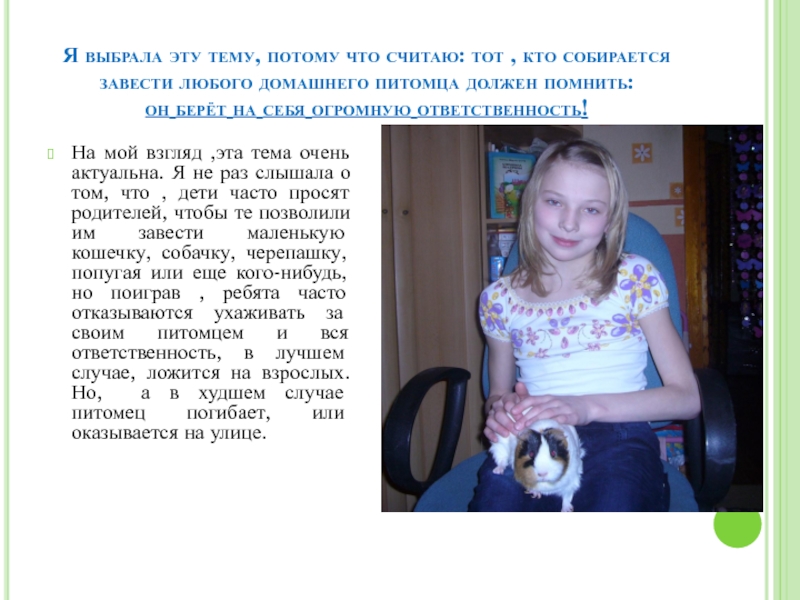 На мой взгляд ,эта тема очень актуальна. Я не раз слышала о том, что , дети часто просят родителей, чтобы те позволили им завести маленькую кошечку, собачку, черепашку, попугая или еще кого-нибудь, но поиграв , ребята часто отказываются ухаживать за своим питомцем и вся ответственность, в лучшем случае, ложится на взрослых. Но, а в худшем случае питомец погибает, или оказывается на улице.