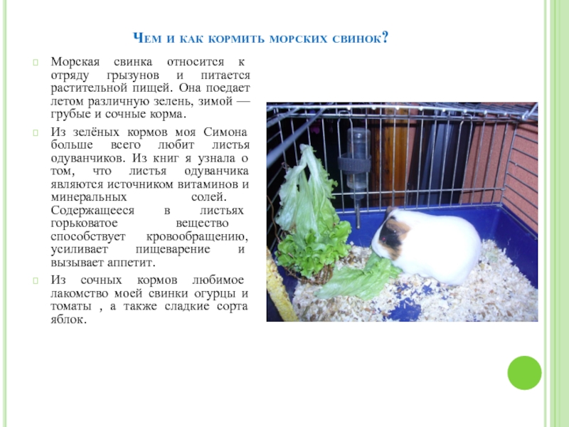 Из зелёных кормов моя Симона больше всего любит листья одуванчиков. Из книг я узнала о том, что листья одуванчика являются источником витаминов и минеральных солей. Содержащееся в листьях горьковатое вещество способствует кровообращению, усиливает пищеварение и вызывает аппетит.