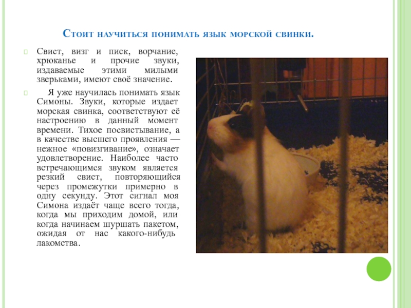 Я уже научилась понимать язык Симоны. Звуки, которые издает морская свинка, соответствуют её настроению в данный момент времени. Тихое посвистывание, а в качестве высшего проявления — нежное «повизгивание», означает удовлетворение. Наиболее часто встречающимся звуком является резкий свист, повторяющийся через промежутки примерно в одну секунду. Этот сигнал моя Симона издаёт чаще всего тогда, когда мы приходим домой, или когда начинаем шуршать пакетом, ожидая от нас какого-нибудь лакомства.