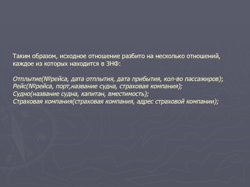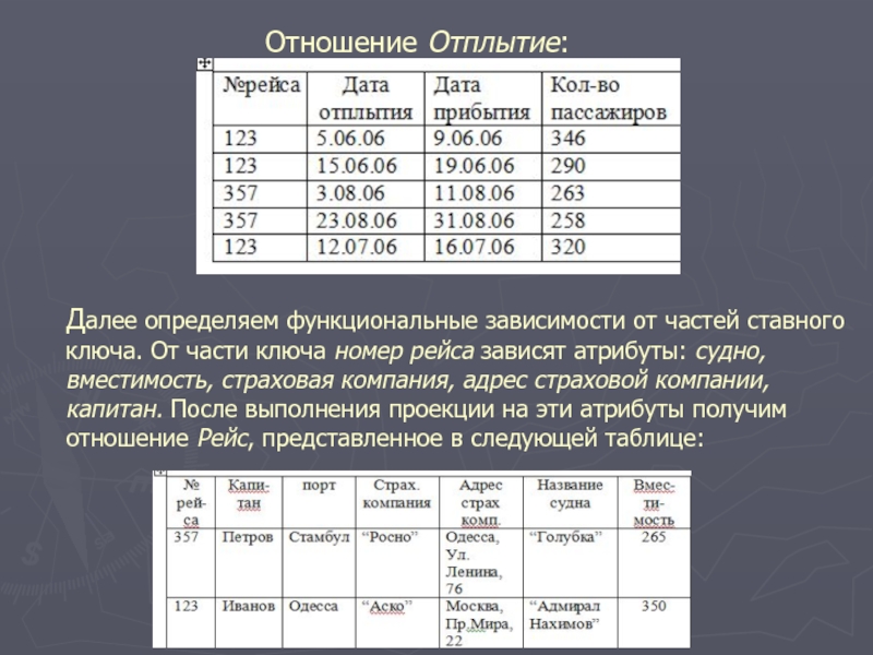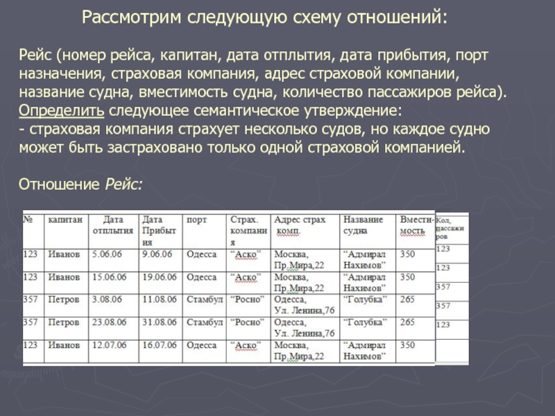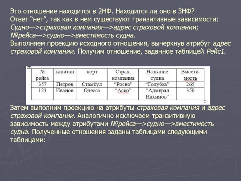 От части ключа номер рейса зависят атрибуты: судно, вместимость, страховая компания, адрес страховой компании, капитан. После выполнения проекции на эти атрибуты получим отношение Рейс, представленное в следующей таблице: