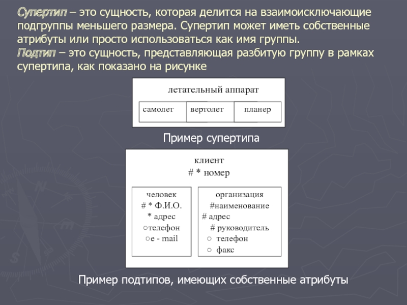 Слайд 7Супертип – это сущность, которая делится на взаимоисключающие подгруппы меньшего