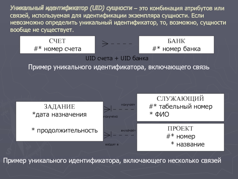 Слайд 6Уникальный идентификатор (UID) сущности – это комбинация атрибутов или связей,