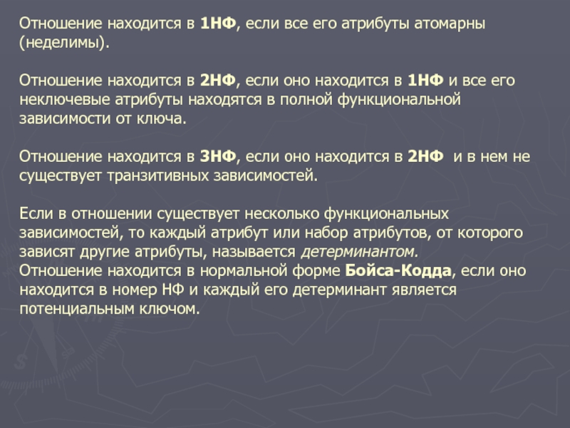 Слайд 15Отношение находится в 1НФ, если все его атрибуты атомарны (неделимы).
