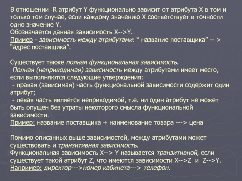 Помимо описанных выше зависимостей, между атрибутами может существовать и транзитивная зависимость.