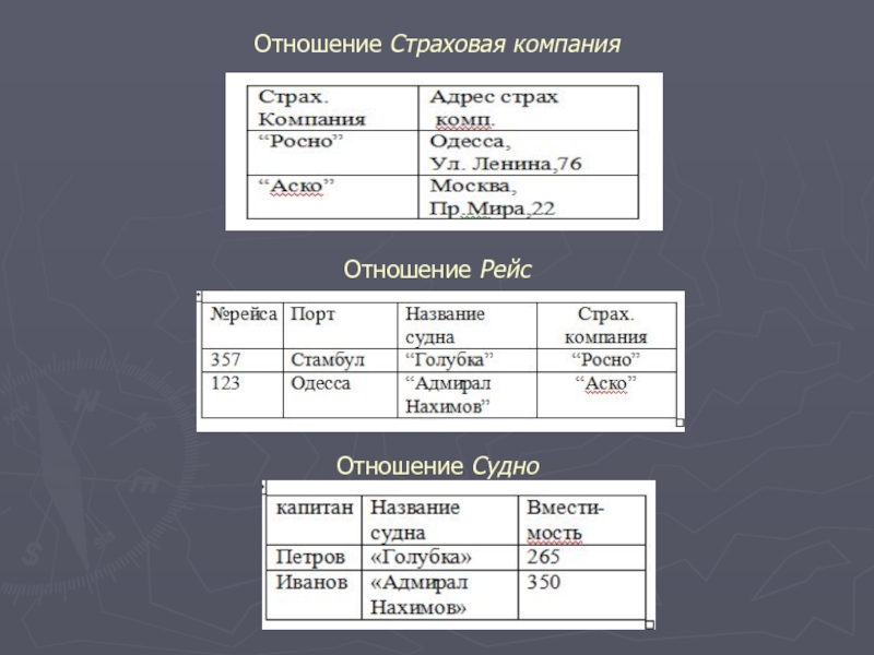 Затем выполним проекцию на атрибуты страховая компания и адрес страховой компании. Аналогично исключаем транзитивную зависимость между атрибутами №рейса—>судно—>вместимость судна. Полученные отношения заданы таблицами следующими таблицами: