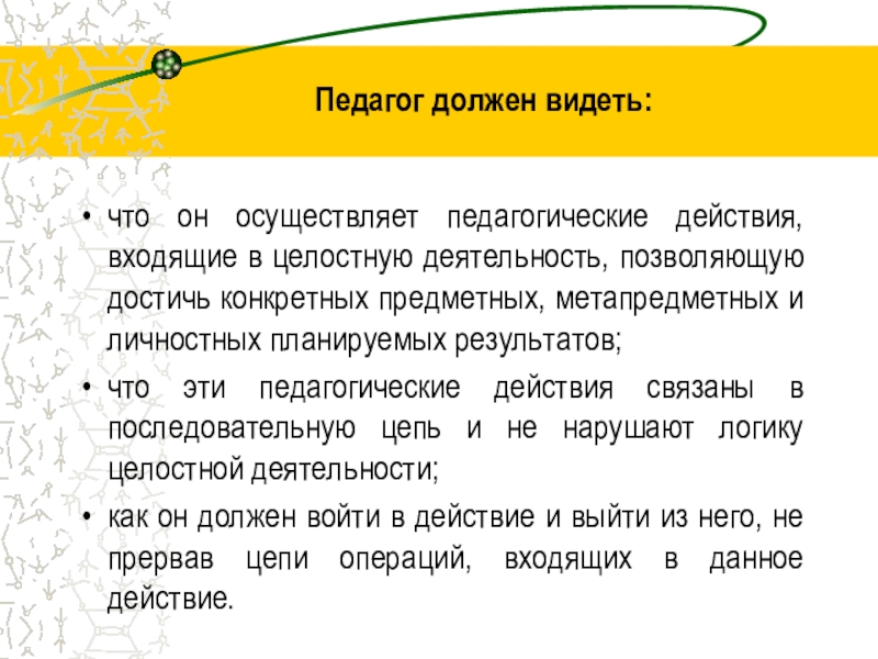 Педагог должен видеть:что он осуществляет педагогические действия, входящие в целостную деятельность, позволяющую достичь конкретных предметных, метапредметных и