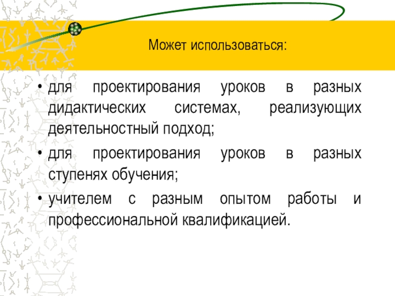 Может использоваться:для проектирования уроков в разных дидактических системах, реализующих деятельностный подход;для проектирования уроков в разных ступенях обучения;учителем