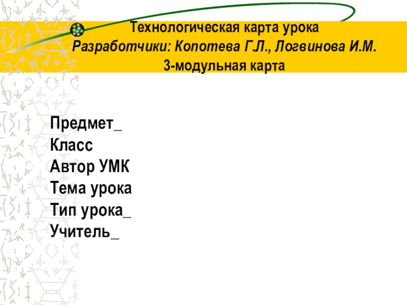 Технологическая карта урока  Разработчики: Копотева Г.Л., Логвинова И.М. 3-модульная карта Предмет_ Класс Автор УМК Тема урока Тип