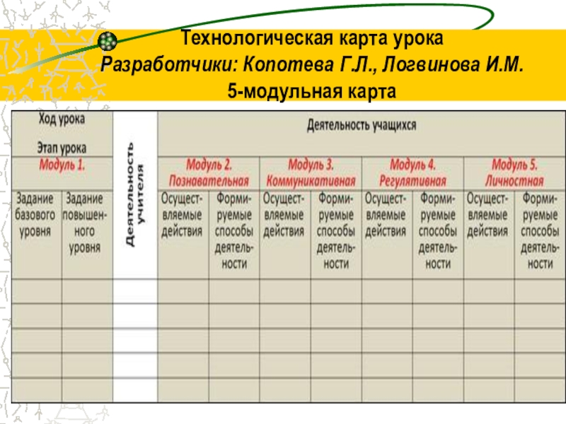 Слайд 10Технологическая карта урока Разработчики: Копотева Г.Л., Логвинова И.М. 5-модульная карта