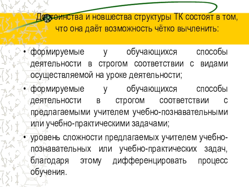Достоинства и новшества структуры ТК состоят в том, что она даёт возможность чётко вычленить: формируемые у обучающихся