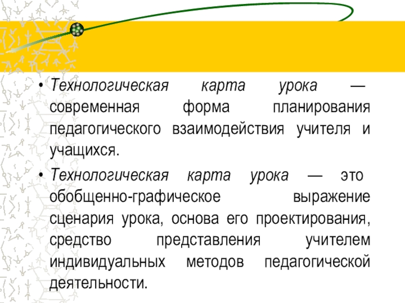 Технологическая карта урока — современная форма планирования педагогического взаимодействия учителя и учащихся. Технологическая карта урока — это обобщенно-графическое выражение сценария урока, основа его проектирования, средство представления учителем индивидуальных методов педагогической деятельности.