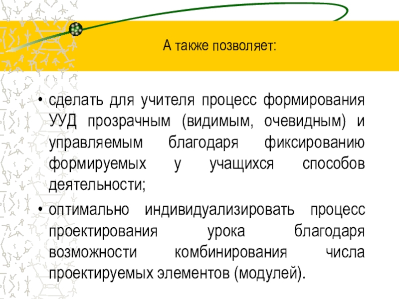 А также позволяет:сделать для учителя процесс формирования УУД прозрачным (видимым, очевидным) и управляемым благодаря фиксированию формируемых у