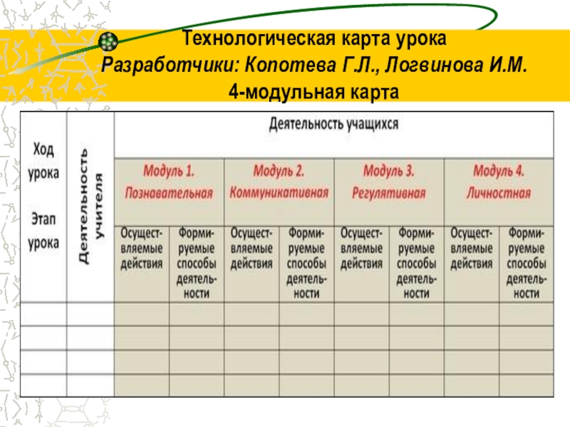 Слайд 11Технологическая карта урока Разработчики: Копотева Г.Л., Логвинова И.М. 4-модульная карта