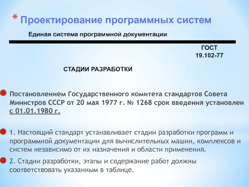 Проектирование программных системПостановлением Государственного комитета стандартов Совета Министров СССР от 20 мая 1977 г. № 1268 срок