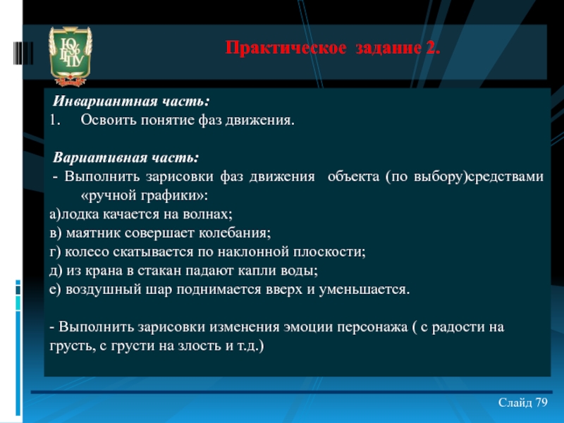 графического дизайна на основе комплекса полученных компетенций в области проектной деятельности. Задачи дисциплины: 1.Сформировать проектное мышление как основу профессиональной деятельности дизайнера. 2. Научить создавать объекты дизайна в соответствии с художественно-конструктивными и технологическими требованиями. 3. Научить разрабатывать комплексы объектов дизайна, образующих ту или иную визуально-информационную и предметную среду на основе современных методов проектирования. 4. Научить обосновыватьи реализовывать художественный замысел, основанный на концептуальном подходе в дизайн-проекте, в макетировании и моделировании. 5. Развить способность свободного использования приобретенных знаний по композиции, колористике в практической проектной деятельности графического дизайнера. 6. Научить применять современную шрифтовую культуру и компьютерные технологии, применяемые в дизайн-проектировании. 7. Развить способность применять методы научных исследований при создании дизайн-проектов и обосновывать новизну собственных концептуальных решений. 8. Развить способность к самоорганизации и самообразованию не только в профессиональной, но и смежных областях деятельности.Слайд 2