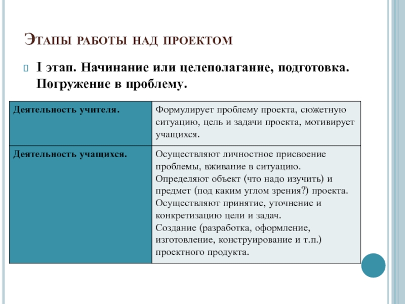 I этап. Начинание или целеполагание, подготовка. Погружение