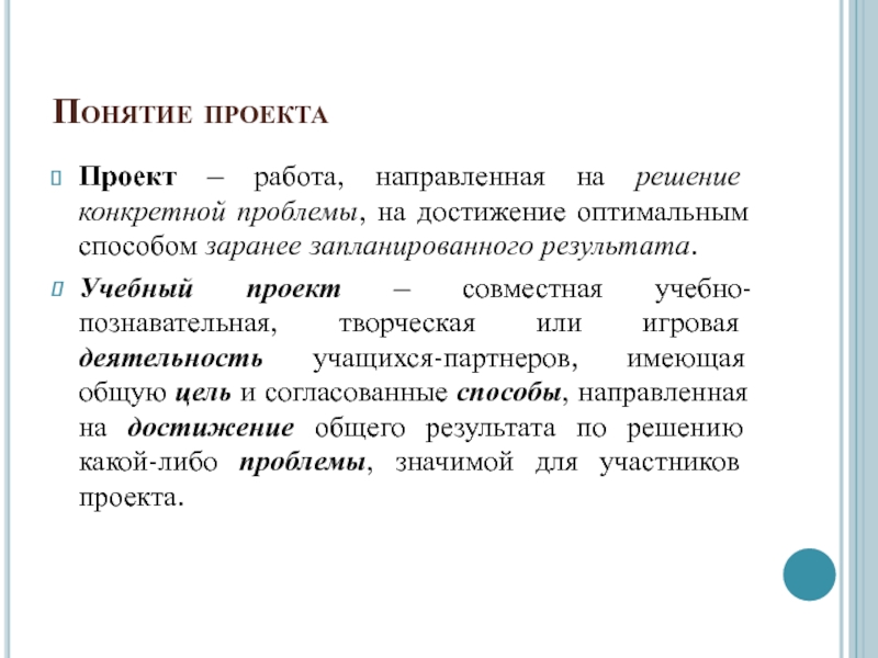 творческая или игровая деятельность учащихся-партнеров, имеющая общую цель и согласованные способы, направленная на достижение общего результата по решению какой-либо проблемы, значимой для участников проекта.
