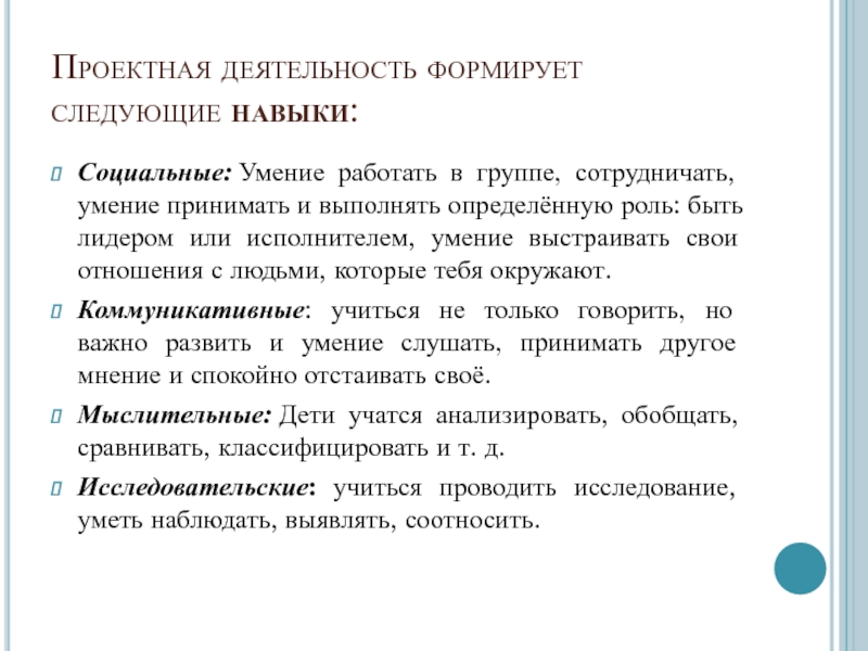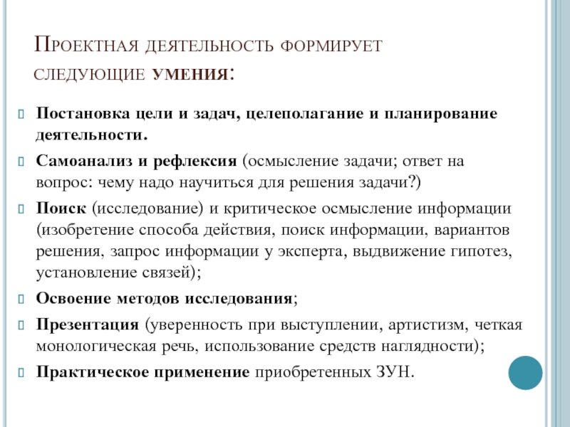 Слайд 5Проектная деятельность формирует следующие навыки: