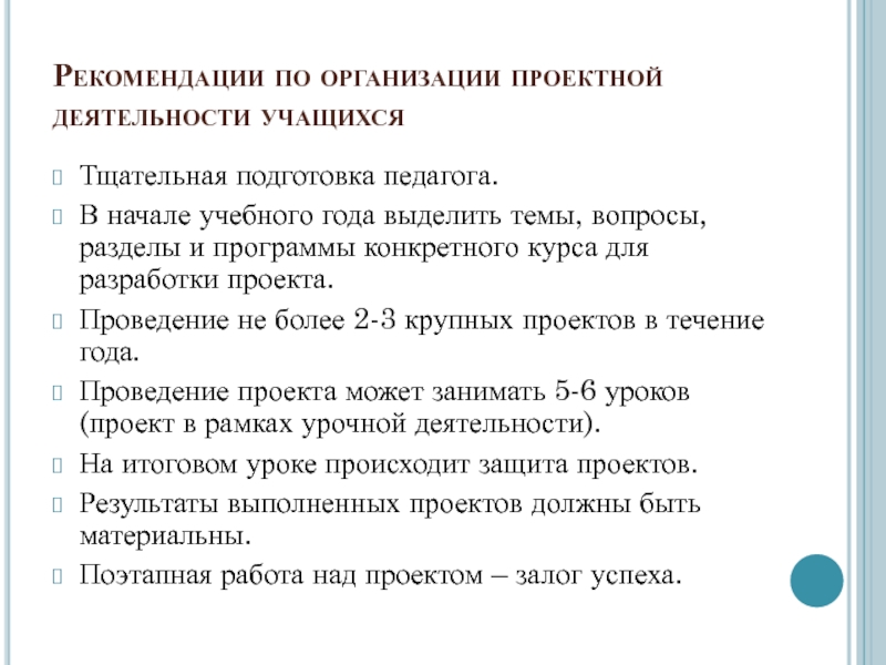 Слайд 28Рекомендации по организации проектной деятельности учащихся