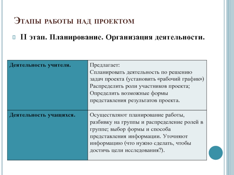 Планирование работы (этапы, отдельные задачи, способы решения задач, ресурсы, сроки);