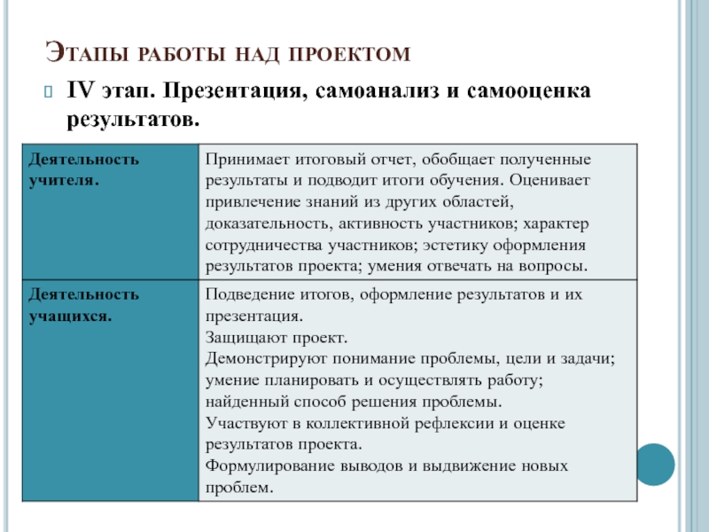 IV этап. Презентация, самоанализ и самооценка результатов.