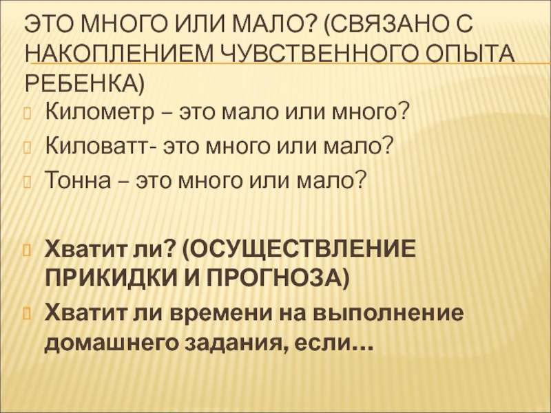 Слайд 12Это много или мало? (связано с накоплением чувственного опыта ребенка)