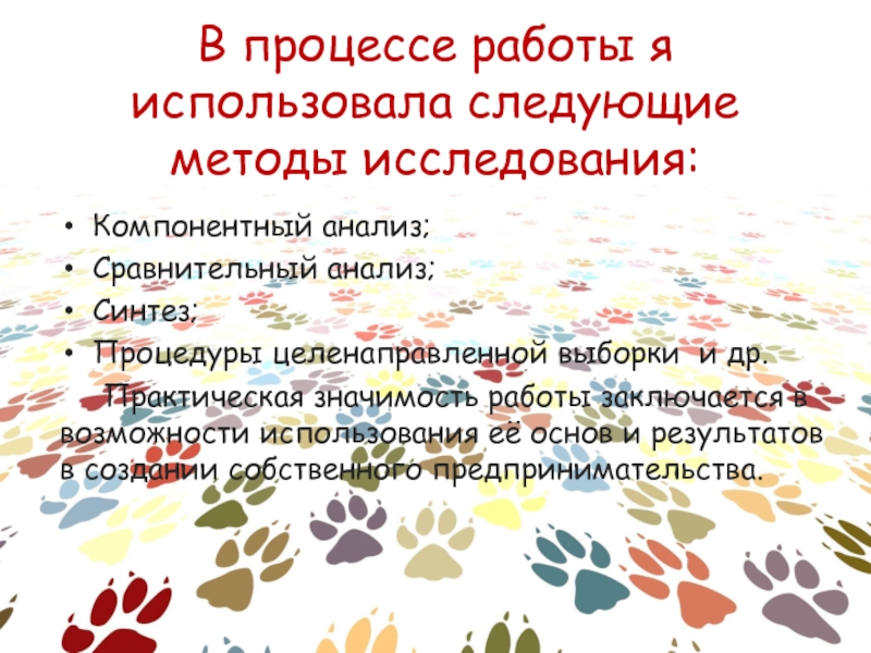 В процессе работы я использовала следующие методы исследования:Компонентный анализ;Сравнительный анализ;Синтез;Процедуры целенаправленной выборки и др. 		Практическая значимость работы